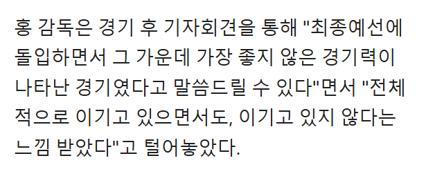 경기 후 기자회견에서 홍명보 황당 소감 rh1 0 177 0 2025.03.21 10:45 "이기고 있는데 이기고 있지 않다는 느낌 받았다"수십억씩 연봉 받는 감독이 참 무책임한 소리... 0