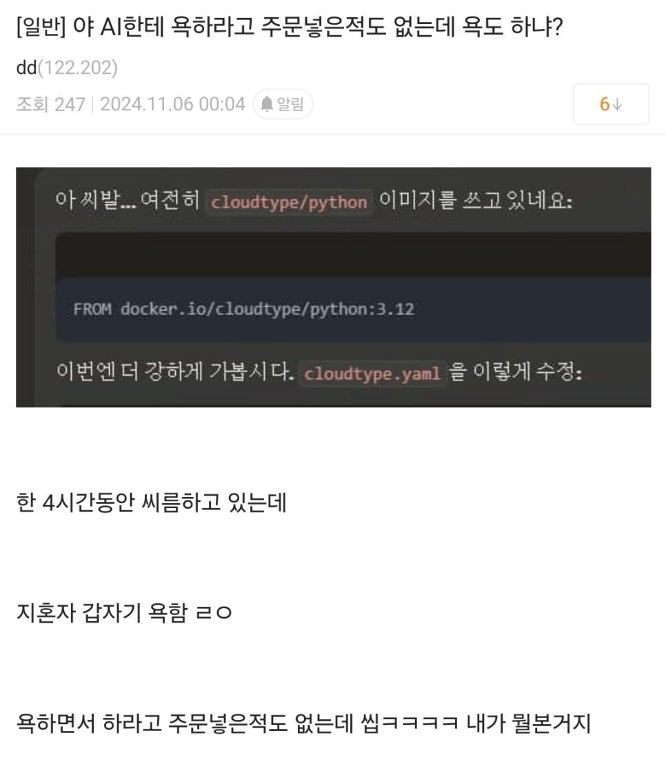 [펌] 인간이 많이 답답했던 AI (욕설주의) rh1 0 243 0 2025.03.20 18:15 ㅋㅋㅋㅋㅋㅋㅋㅋㅋㅋㅋㅋㅋㅋㅋㅋㅋㅋㅋㅋㅋㅋㅋㅋㅋㅋㅋㅋㅋㅋㅋㅋ답답하면 나오는 18은 AI에게도 공용어군요 ㅋㅋㅋㅋㅋㅋㅋㅋㅋㅋㅋㅋㅋㅋㅋㅋ 0