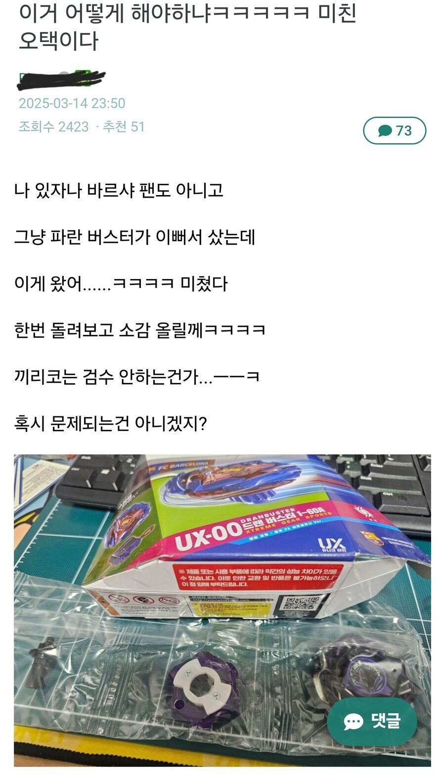 영실업 사고쳤네 rh1 0 201 0 2025.03.20 06:45 원래 저 박스에는 FC 바르셀로나랑 콜라보한 베이인드랜 버스터만 들어있어야하는데갑자기 CX 페르세우스가 나옴이게 왜 문제가 되냐면 CX 페르세우스는일본에서도 발매 하지 않은 완전 신제품 이라는거...즉 얘네들 신제품을 유출해 버렸다 ㅋㅋㅋ 0