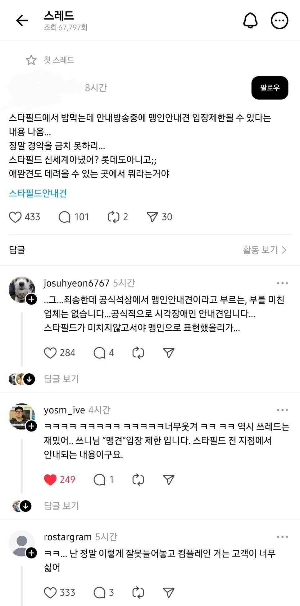 스타필드 맹인 안내견 출입금지래..