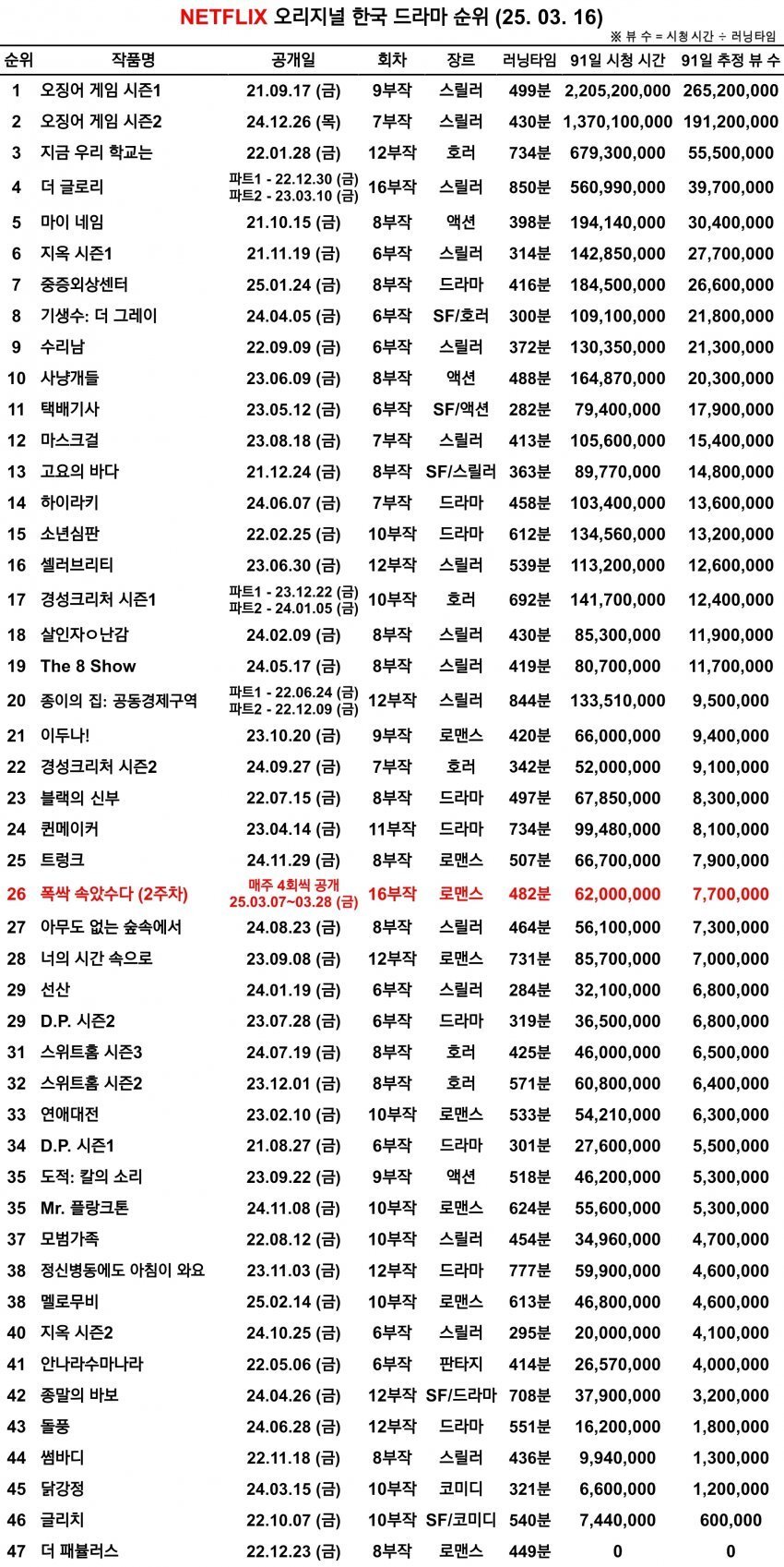넷플릭스 오리지널 한국 드라마 순위 rh1 0 185 0 2025.03.20 00:15 지금 방영중인 폭싹 속았수다 포함 성적입니다 오겜이 넘사긴 하네요 ㅎ 넷플릭스 오리지널 한국 드라마 순위 0