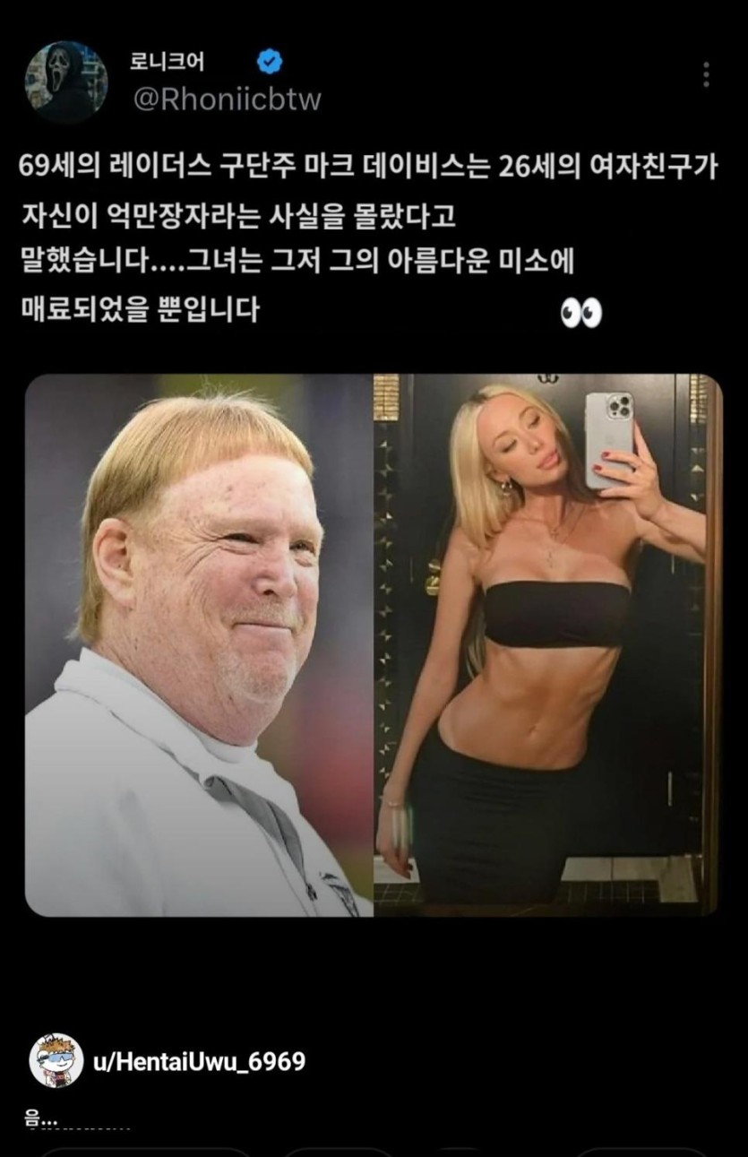 69세의 남친이 억만장자인지 몰랐다는 26세의 여자친구 rh1 0 890 0 2025.03.19 23:15 그나마 생각할수 있는게 부자인건 알았어도 그정도로 부자인지는 몰랐다는걸려나 0