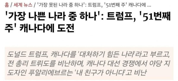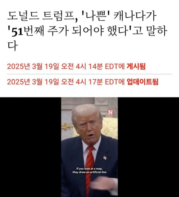 이후 기분이 언짢은 와중 진행한 폭스뉴스 인터뷰에서 캐나다 얘기가 나오자 갑자기 급발진하시는데....