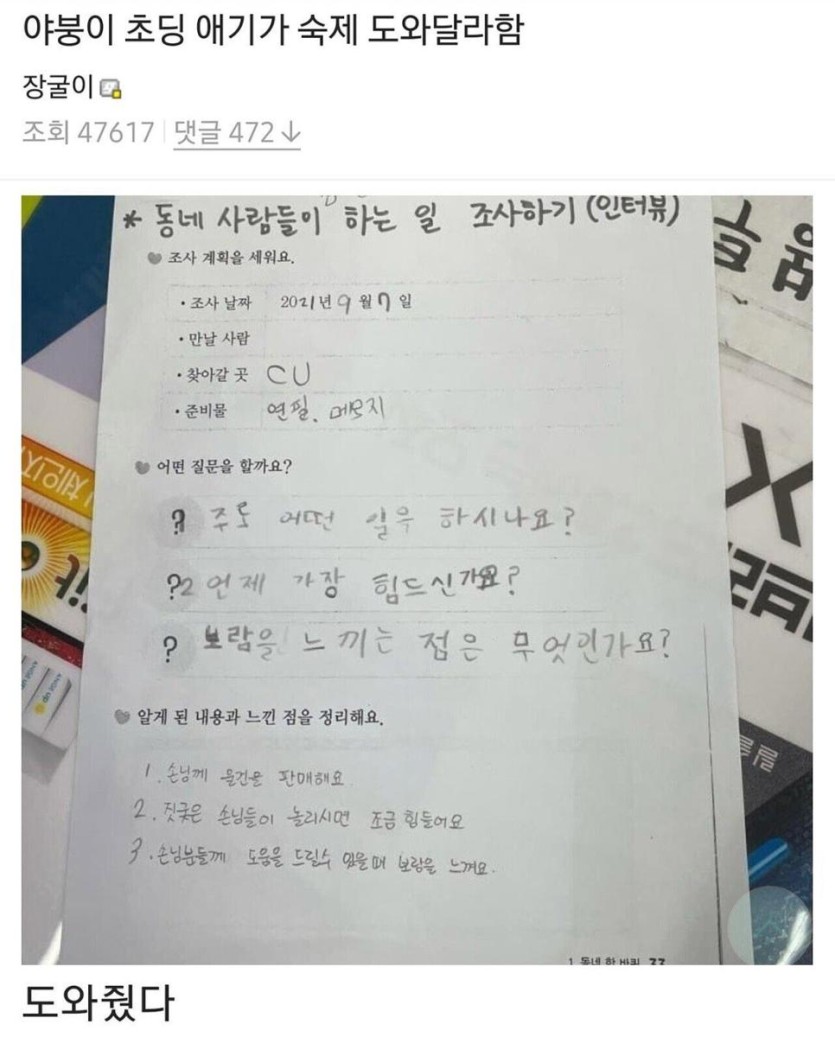 초등학생 숙제를 도와준 편의점 알바생