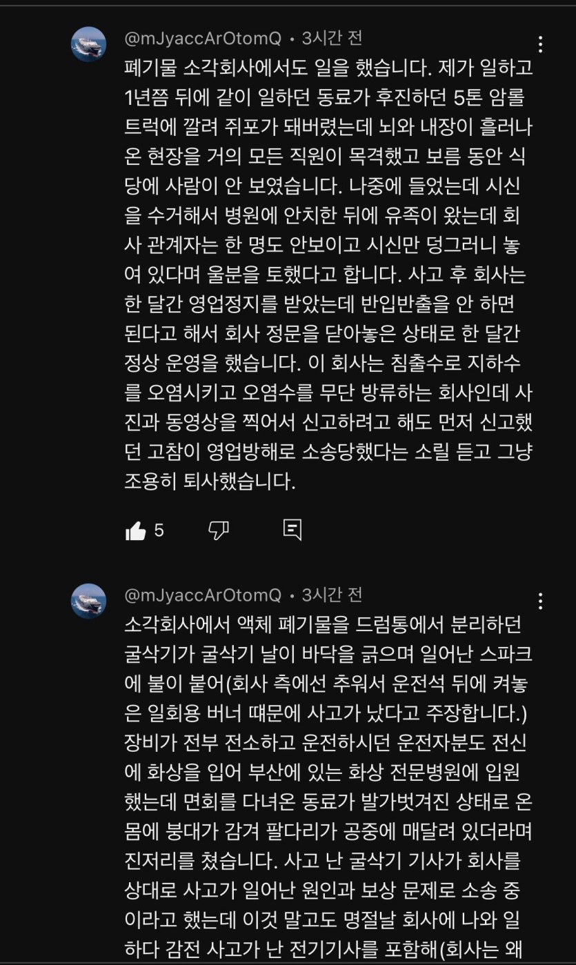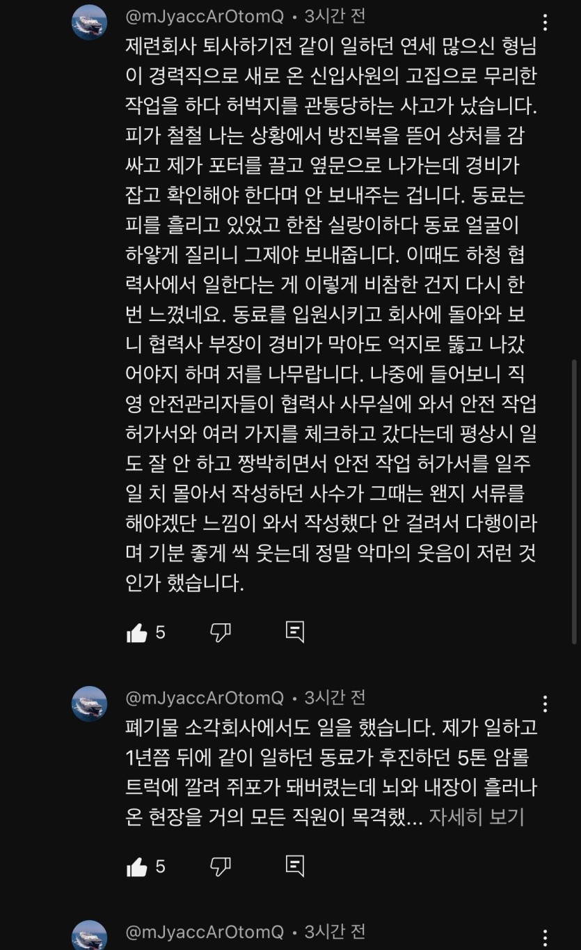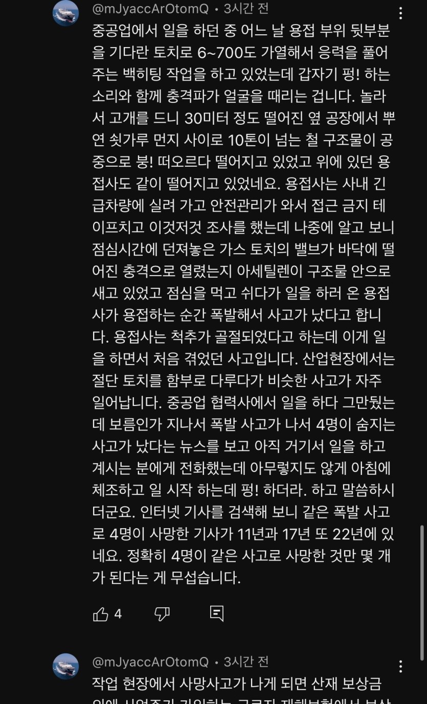 현대제철 사망사고 충격적인 현직자 경험담 유튜브 댓글