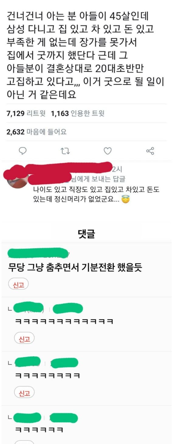 [유머] 아는집 45세 아들 장가못가 굿한 사연