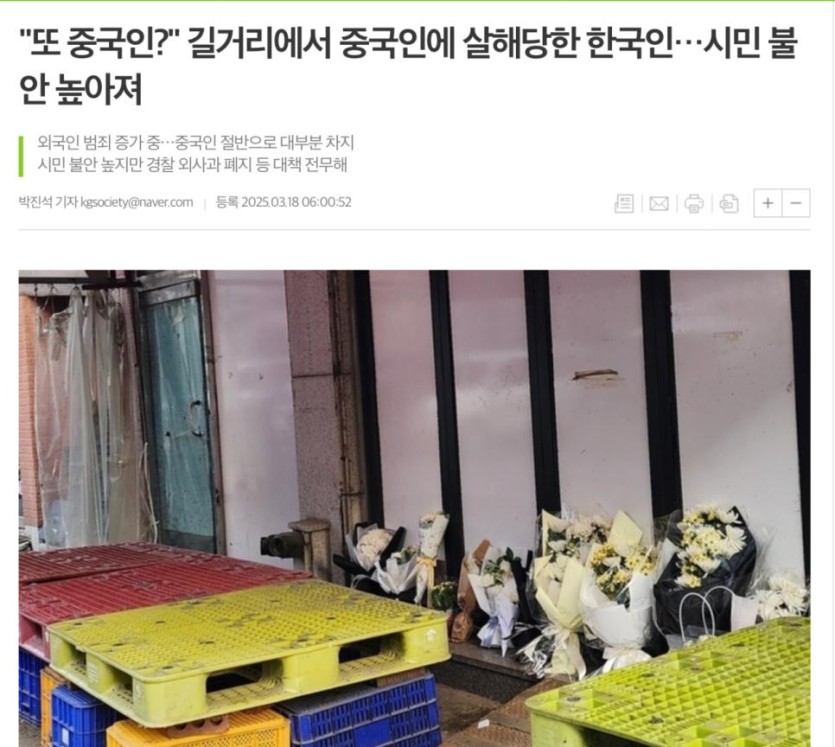 길거리에서 중국인에 살해당한 한국인.. rh1 0 257 0 2025.03.19 08:00 https://kgnews.co.kr/news/article.html?no=835413지난 7일 오전 3시 29분쯤 수원시 장안구 정자동의 길거리에서 중국인 40대 A씨가 한국인 60대 B씨에게 흉기를 휘둘렀다.이들은 팔달구 우만동에서 각자 청과물을 운영하던 업주들로, A씨는 B씨가 본인의 가게를 험담해 범행했다는 취지로 진술했다.인근 자영업자 C씨는 "온 동내가 흉흉하다. 안 그래도 중국인을 포함한 많은 외국인들이 거주하고 있어 가끔 놀라기도 한다"며"외국인이 잠재적 범죄자라는 편견을 가져선 안 되겠지만 무서운 건 사실"이라고 전했다.특히 중국인 밀집 지역인 수원역 인근 주민들은 밤에 마음 놓고 돌아다니지 못한다며 불안을 호소하기도 했다.팔달구 고등동 주민 D씨는 "수원역에서 조금만 더 들어가면 중국인 밀집 거리가 나오는데 밤에는 함부러 돌아다닐 엄두가 나지 않는다"며"자칫 시비라도 걸렸다가 흉기를 휘두르면 꼼짝없이 당하는 것 아닌가. 최대한 방문을 자재하려 한다"고 호소했다.다른 주민 E씨는 "간판이 모두 중국어로 적혀있는 고등동 일대에선 밤마다 싸움이 벌어지거나 고성이 오가는 등 무서운 동내"라며"대한민국이 글로벌 사회가 되면서 외국인 증가를 막을 순 없겠지만 그에 대한 국민들의 불안감을 해소해야 하지 않겠나. 대책이 필요하다"고 토로했다. 0