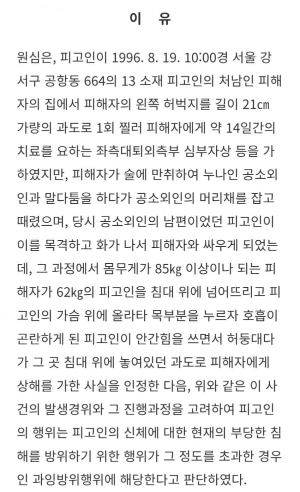 이혼소송중인 남편이 찾아와서 빻취 야스하자고 가위로 폭행해서 칼로 찔러죽였는데 정당방위, 과잉방위 아님 걍 살인