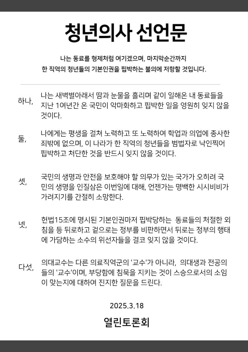 청년의사 선언문 : 온 국민이 1년동안 의사를 악마화하고 핍박한 일을 영원히 잊지 않을 것이다