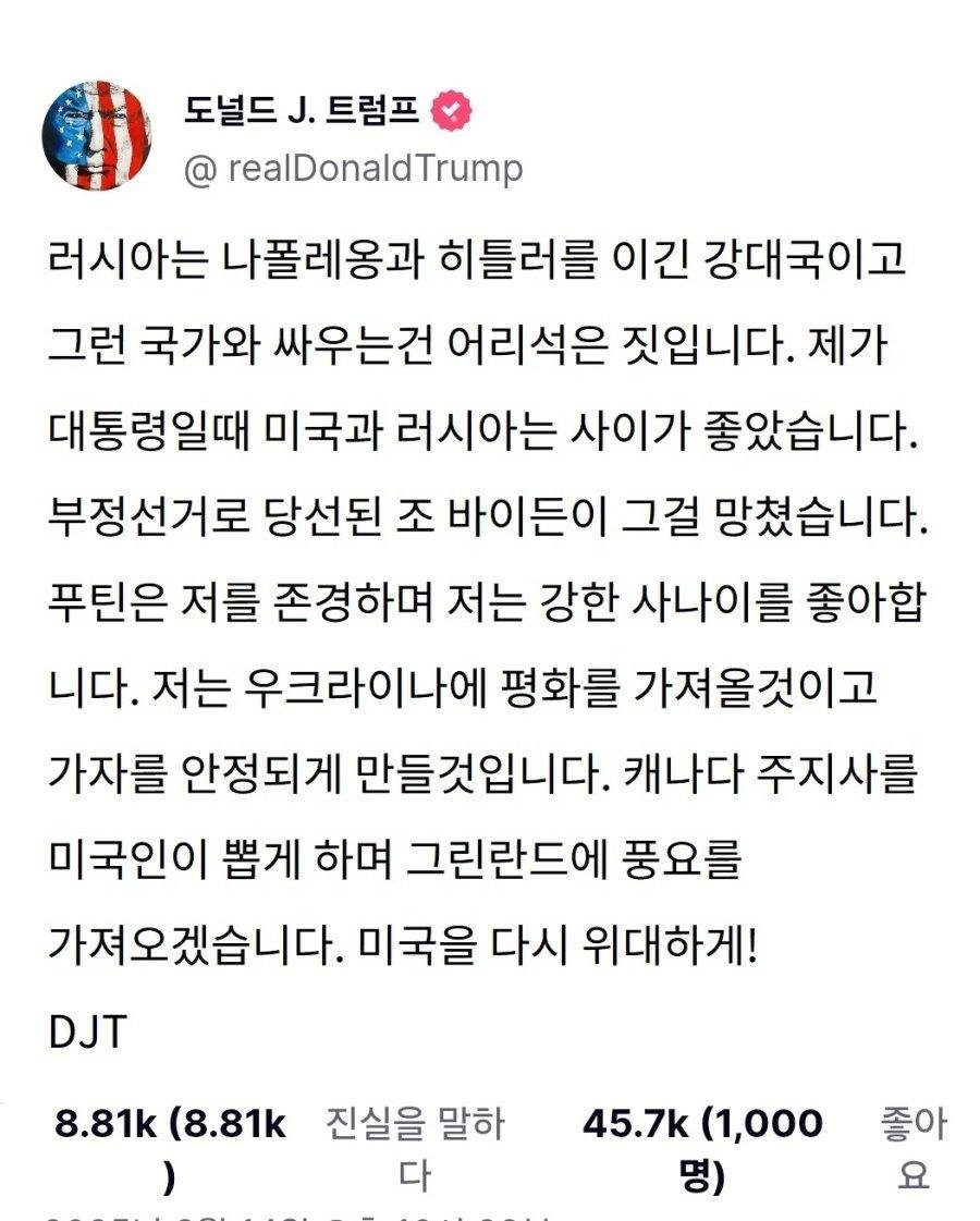 트럼프가 자신의 생각을 트윗 하나로 요약 rh1 0 82 0 2025.03.17 23:30 러시아 = 내 친구우크라이나 = 니들이 손해보고 참아가자 = 미국이 먹으면 이스라엘이 더는 못건드려캐나다 = 합병할거야그린란드 = 미국 땅 0