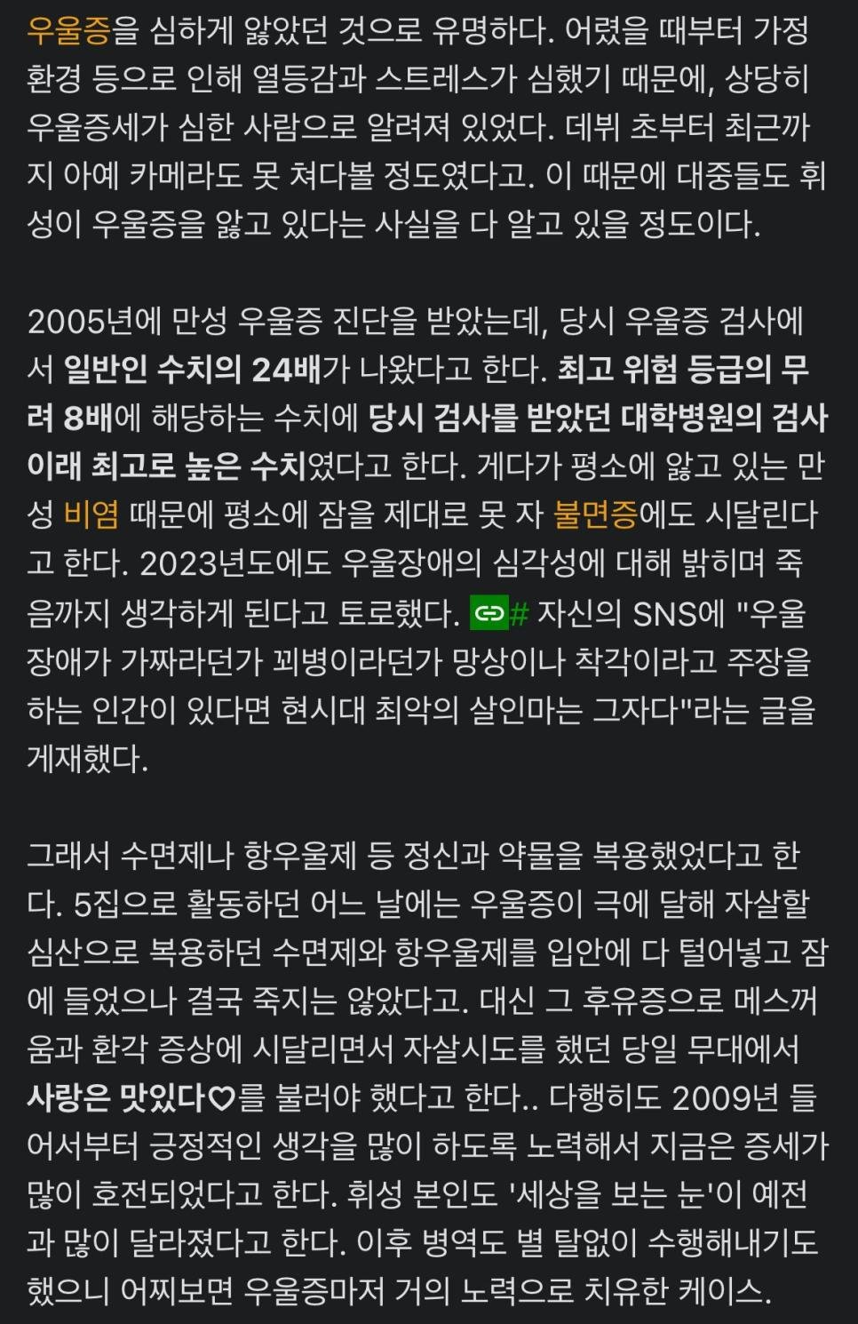휘성 우울증 수준.jpg rh1 0 81 0 2025.03.17 22:45 일반인의 24배최고등급의 8배당시 기준 대학병원 최고수치 기록엄청난 우울감을 느끼며 공연전역 이후 많이 좋아졌지만 최근까지 우울감 호소 .. 0