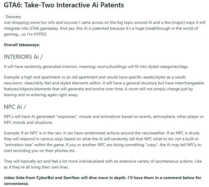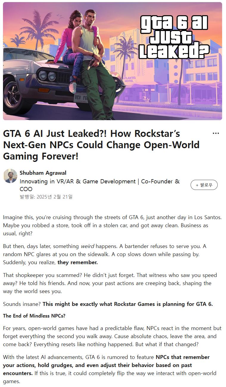 GTA6에 적용될 Ai기술 rh1 0 126 0 2025.03.17 22:00 요약 - 범죄 일으키고 도망가서 별 없어져도 플레이어 목격한 NPC가 플레이어를 기억해서 보면 도망가거나 상점 주인이면 문을 잠그거나 목격한 경찰이 또 쫓아옴. - 인테리어 Ai를 통해 대략 70%의 빌딩의 내부가 렌더링 된다고 함 (자동생성) - NPC가 상황에 따라 말을 바꿈.취하면 시비를 걸고 비 오면 우산 쓰라하고 플레이어가 또라이짓 하면 폰 꺼내서 동영상 찍음. 0