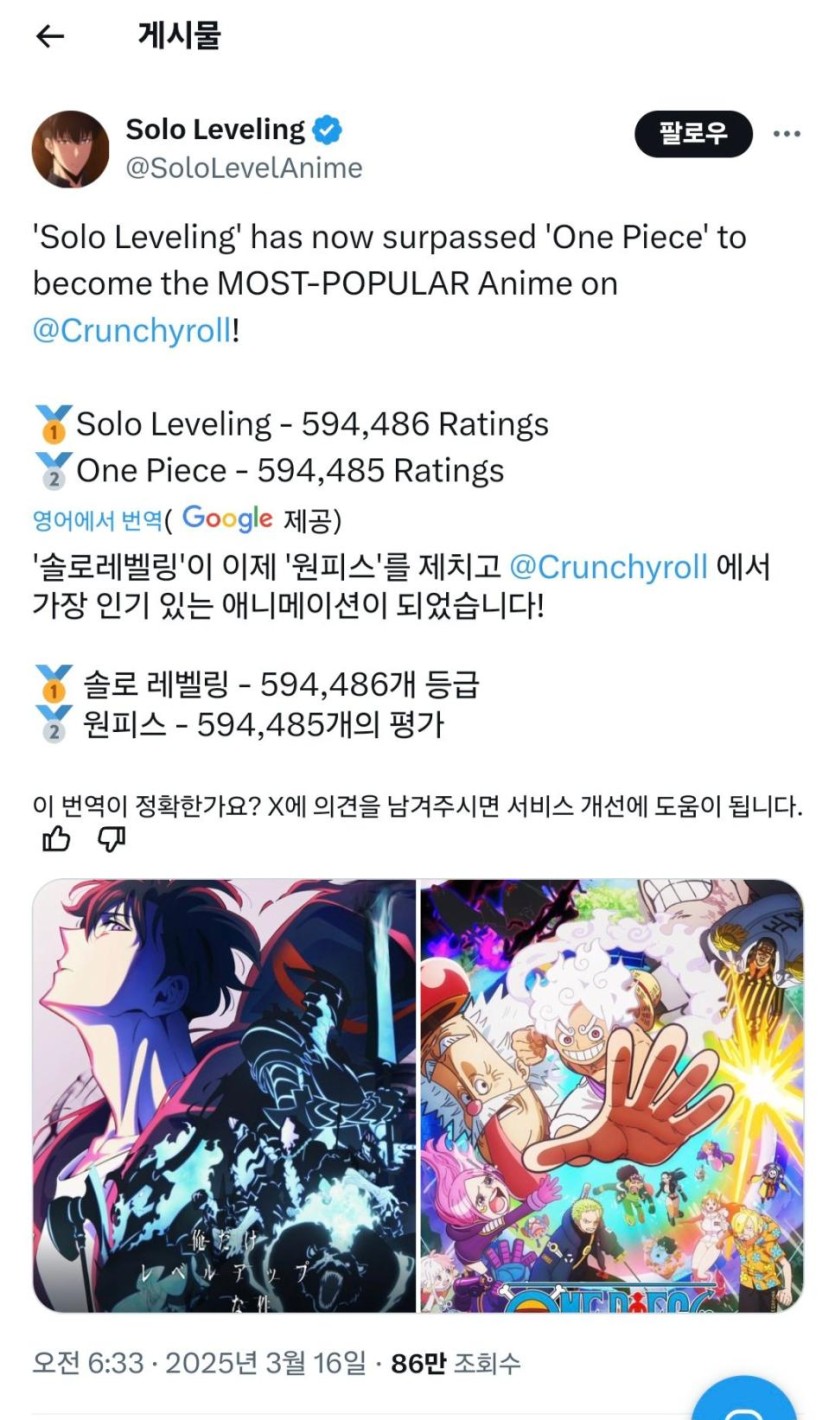 미국에서 나혼자만레벨업이 인기라고? 국뽕 ㄴㄴ rh1 0 210 0 2025.03.16 16:45 미국에서 공사하는 형님들이 사무실에서 나혼렙을 보고있음그냥 한컷 정도 찍힌거 아님?이라고 생각할수도 있는데 진짜임크런치롤 이라는 미국 애니 ott가 있는데 원피스를 제치고 1등을 함그냥 서양쪽에서 반응이 좋다고 함 0