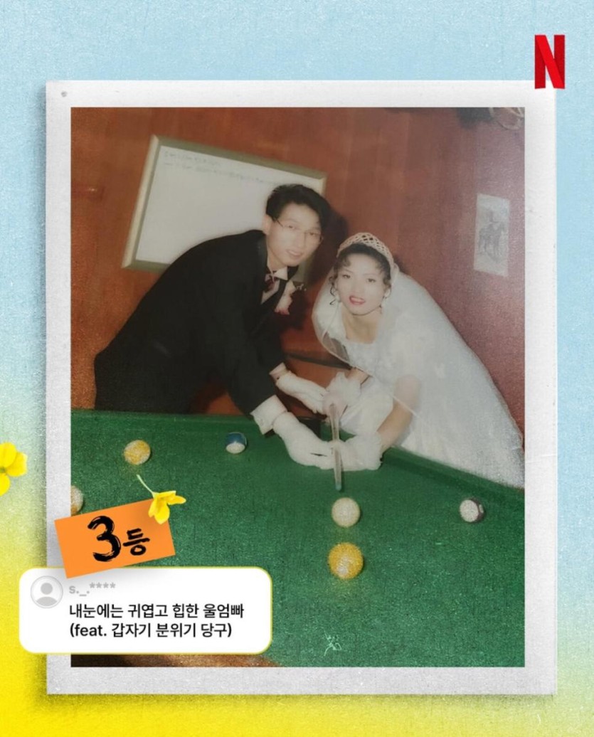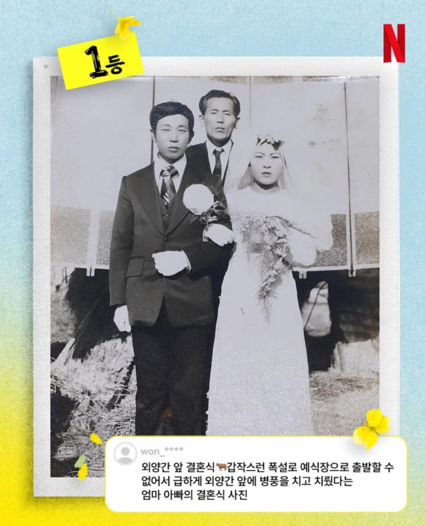 넷플릭스에서 연 웃긴 결혼사진대회 rh1 0 143 0 2025.03.15 23:30 인기리에 방영중인 폭싹속았수다.에서 결혼식장면이 화제였는데다큰 딸이 본 엄마의 결혼식사진을 본 딸이 “엄마 저모자는 왜쓴거야? 벌칙이였어?” 라는 말을 해서 화제되어 냇플릭스에 사진을 보내는 컨텐츠가 열림1등: 외양간에서 2.겨자이크 3.그려준 눈썹공동3등: 갑분당구 공동3등:폭죽공등3등 그시절ㅊ갬성 공동3등쉽지않음.. 그외에 ㅋㅋㅋㅋㅋㅋㅋㅋ 0