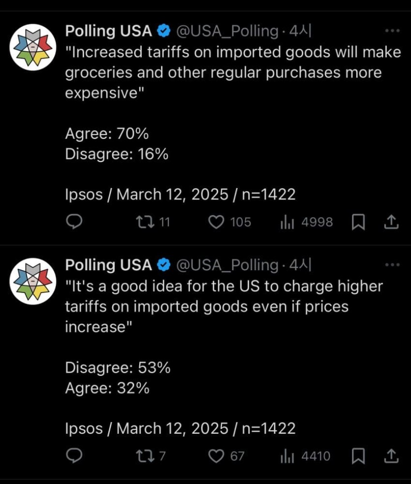 물가가 오르더라도 수입품에 더 높은 관세를 매겨야함: 동의 32% 비동의 53%