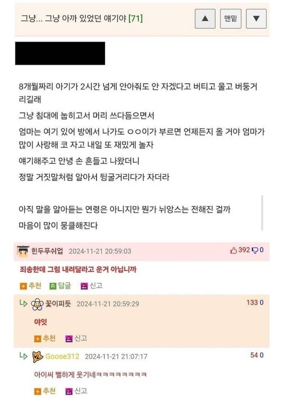 [유머] 2시간 넘게 울던 8개월 아기를 겨우 재운 엄마