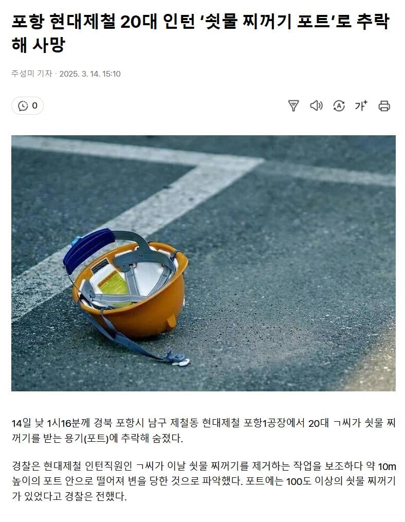 20대 인턴 쇳물 찌꺼기 포트 추락 사망