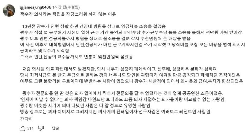 나는 솔로 25기 광수가 자기가 의사인걸 자랑스러워 하지 않는 이유 rh1 0 241 0 2025.03.13 20:45 광수가 의사를 자랑스러워하지 않는 이유 의사들이 가기 꺼려하는 강원도 인제로 와서 환자들 보는 중인제에서 의사가 자기 밖에 없어서 자리를 비울수 없어 주말만 연애 가능하다고 말함 0