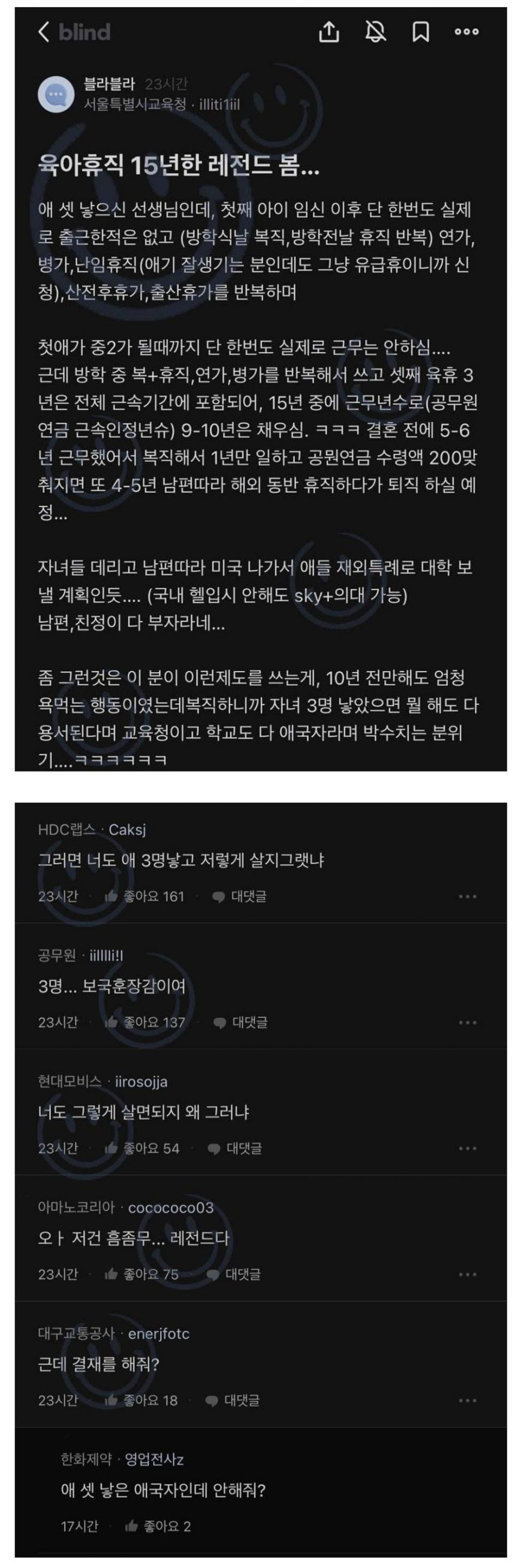 육아휴직 15년쓴 선생님을 봤다는 블라인드