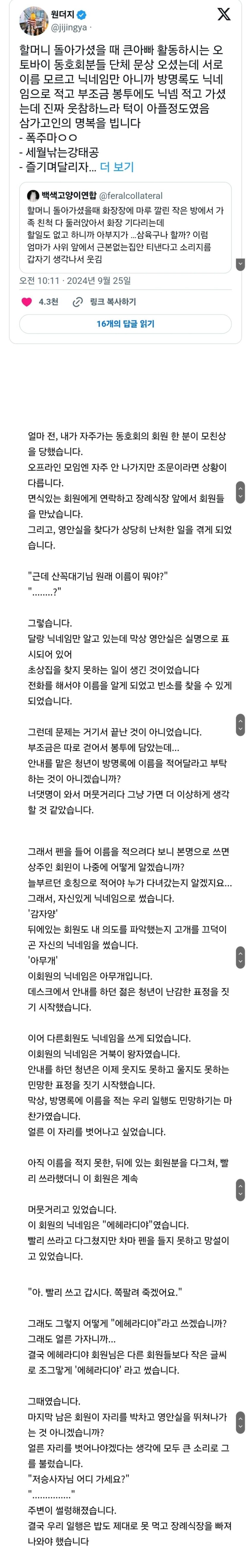 할머니 장례식에 큰아빠 동호회멤버들이 왔는데 서로 본명을 몰라서...