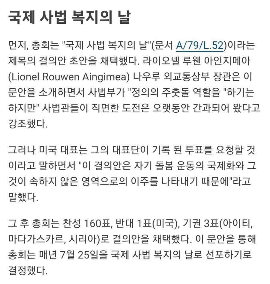 오늘 미국이 UN에서 반대 투표한 것들 rh1 0 126 0 2025.03.13 10:15 평화공존은 중국이 연상된다해서 반대국제 희망의 날, 국제 사법 복지의 날, 민주주의를 위한 교육은 미국만 유일하게 반대함 0