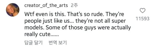 '대충 이 영상은 정말 무례하며 그들은 모델이 아니고 몇몇은 좀 귀엽게 생겼다는 댓글'