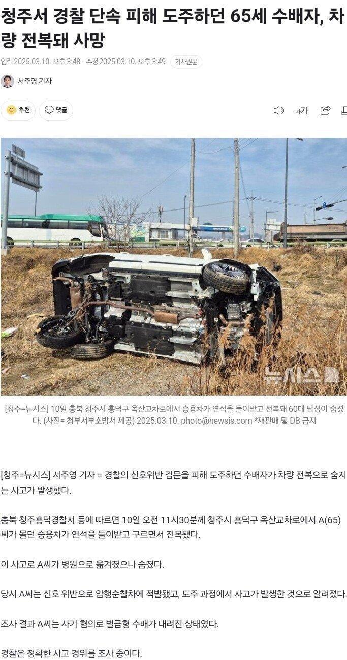 청주서 경찰 단속 피해 도주하던 65세 수배자, 차량 전복돼 사망 rh1 0 158 0 2025.03.13 01:30 https://n.news.naver.com/mnews/article/003/0013110405수배중인 사기꾼이 경찰 피해 도망가다 자빠져서 뒤짐병신 0
