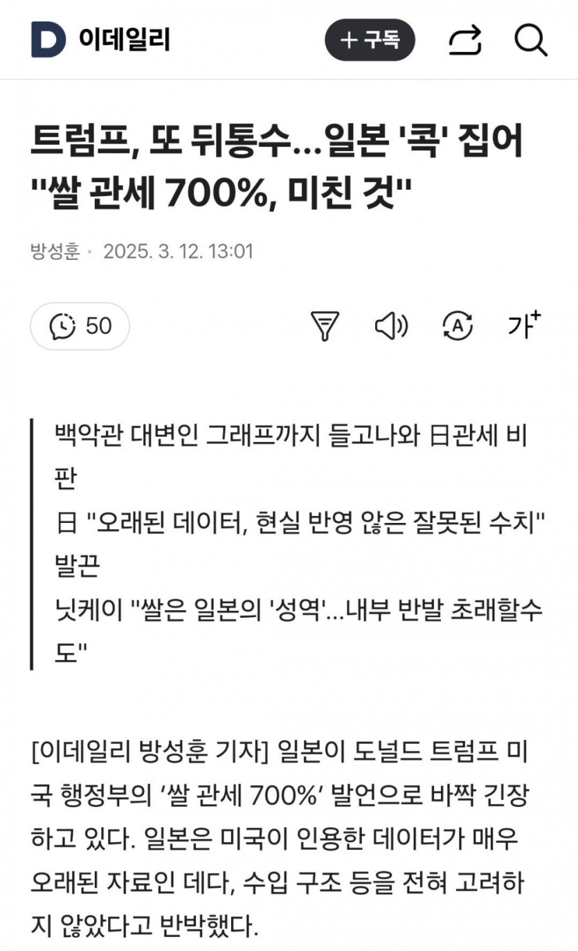 트럼프, 또 뒤통수…일본 콕집어 "쌀 관세 700%, 미친 것" rh1 0 144 0 2025.03.12 22:15 일본에 1400% 때릴려나? ㅅㅂ ㅋㅋㅋㅋㅋ 트럼프, 또 뒤통수…일본 콕집어 "쌀 관세 700%, 미친 것" 0