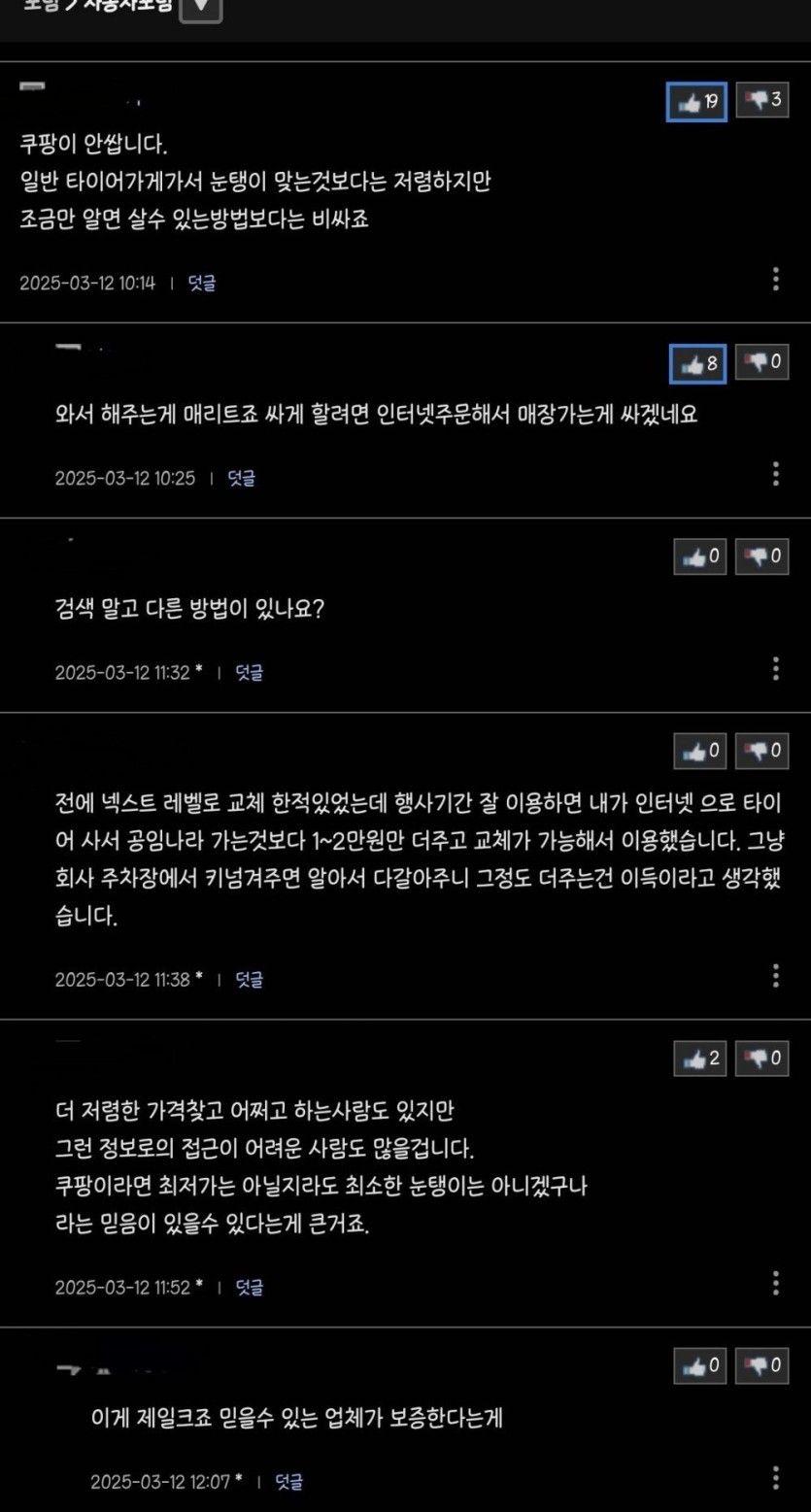 타이어 시장은 쿠팡이 휩쓸겠네요 rh1 0 115 0 2025.03.12 22:15 당연히 발품팔아서 하는거보단 비싸지만최소 눈탱이는 안맞는다내가 가는게 아닌 쿠팡이 와서 해준다이 2개가 메리트라고함 타이어 시장은 쿠팡이 휩쓸겠네요 0