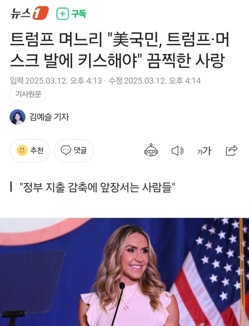 트럼프 며느리 "美국민, 트럼프·머스크 발에 키스해야" rh1 0 108 0 2025.03.12 18:30 https://n.news.naver.com/mnews/article/421/0008126177?sid=104 0