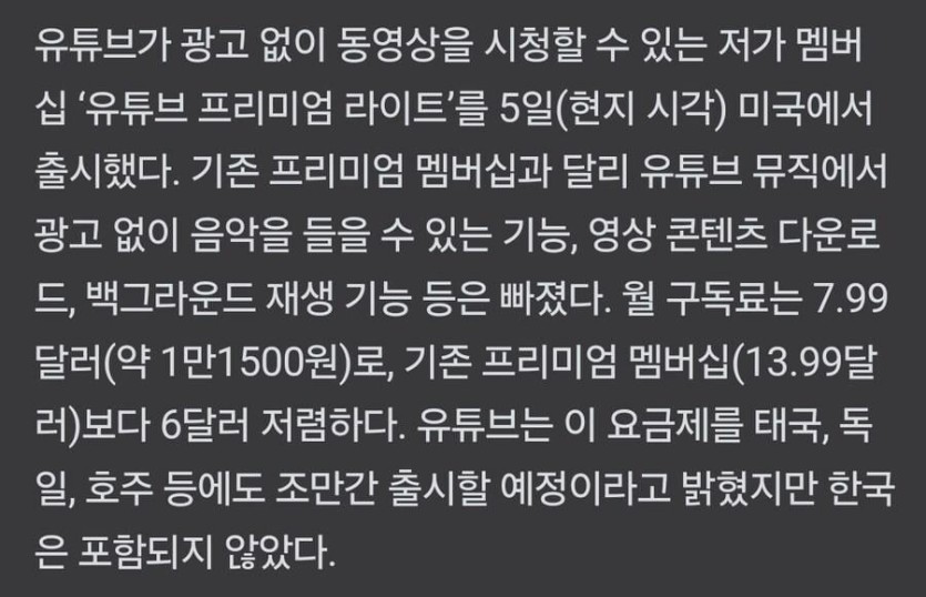 유튜브 프리미엄 신규요금제 출시 rh1 0 229 0 2025.03.12 09:31 프리미엄라이트유튜브뮤직 빠지고, 백그라운드 재생 빠짐기존 프리미엄 대비 6달러 저렴출시국중에서 일단 한국은 제외 0