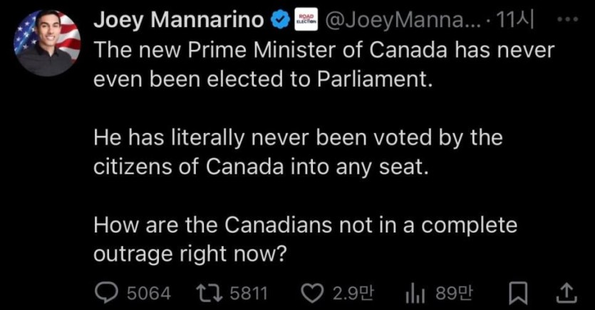 “트뤼도 총리가 공식적으로 퇴진했고, 또 다른 좌파인 마크 카니가 캐나다의 총리로 교체되었습니다. 그는 85.9%의 득표율을 기록했습니다.