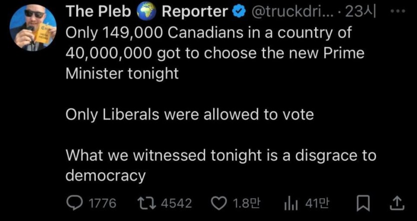 “캐나다의 인구는 4천만 명인데, 겨우 14만 9천 명만이 오늘 밤 새로운 총리를 선택했습니다.