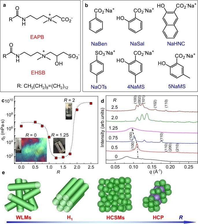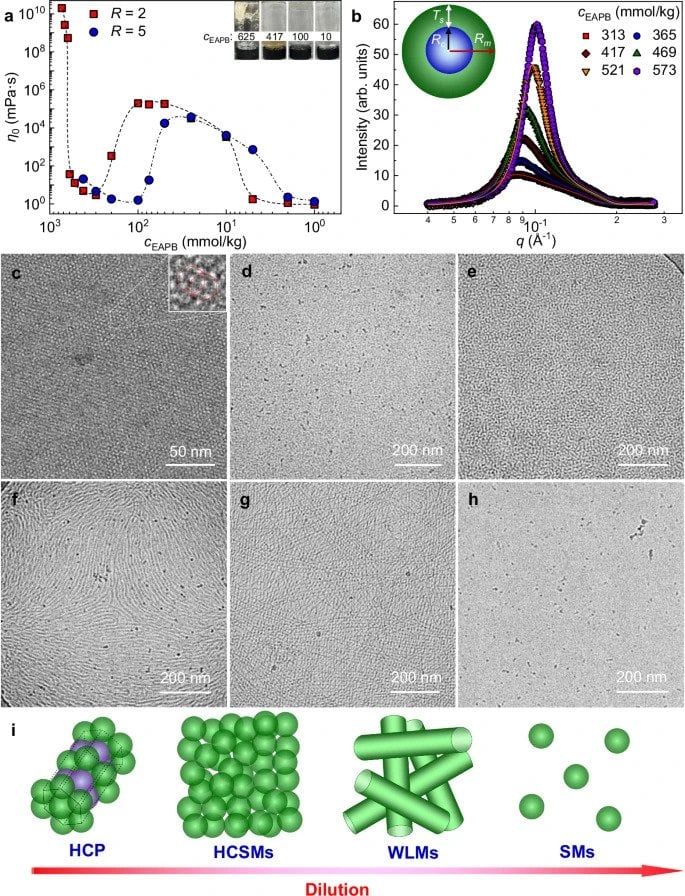 여기서 물을 더 넣어버리면 점도상승에 한계를 맞아서 WLMs형태를 유지하지 못하고 작은 구형의 미셀(SMs)형태로 바뀌게 되면서 점도가 급격하게 내려감