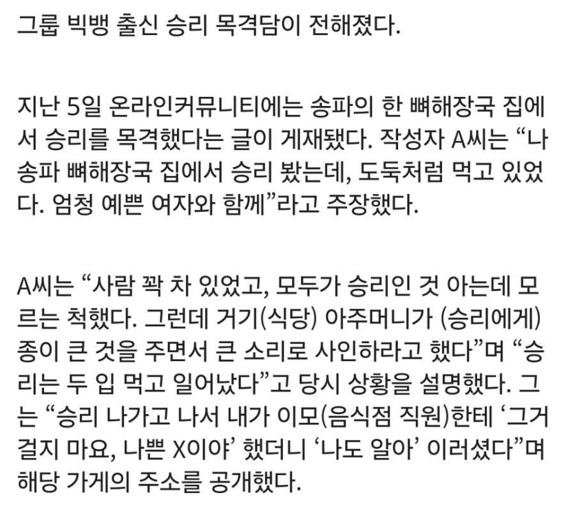 빅뱅 전 멤버 승리 서울 뼈해장국집 목격담.JPG