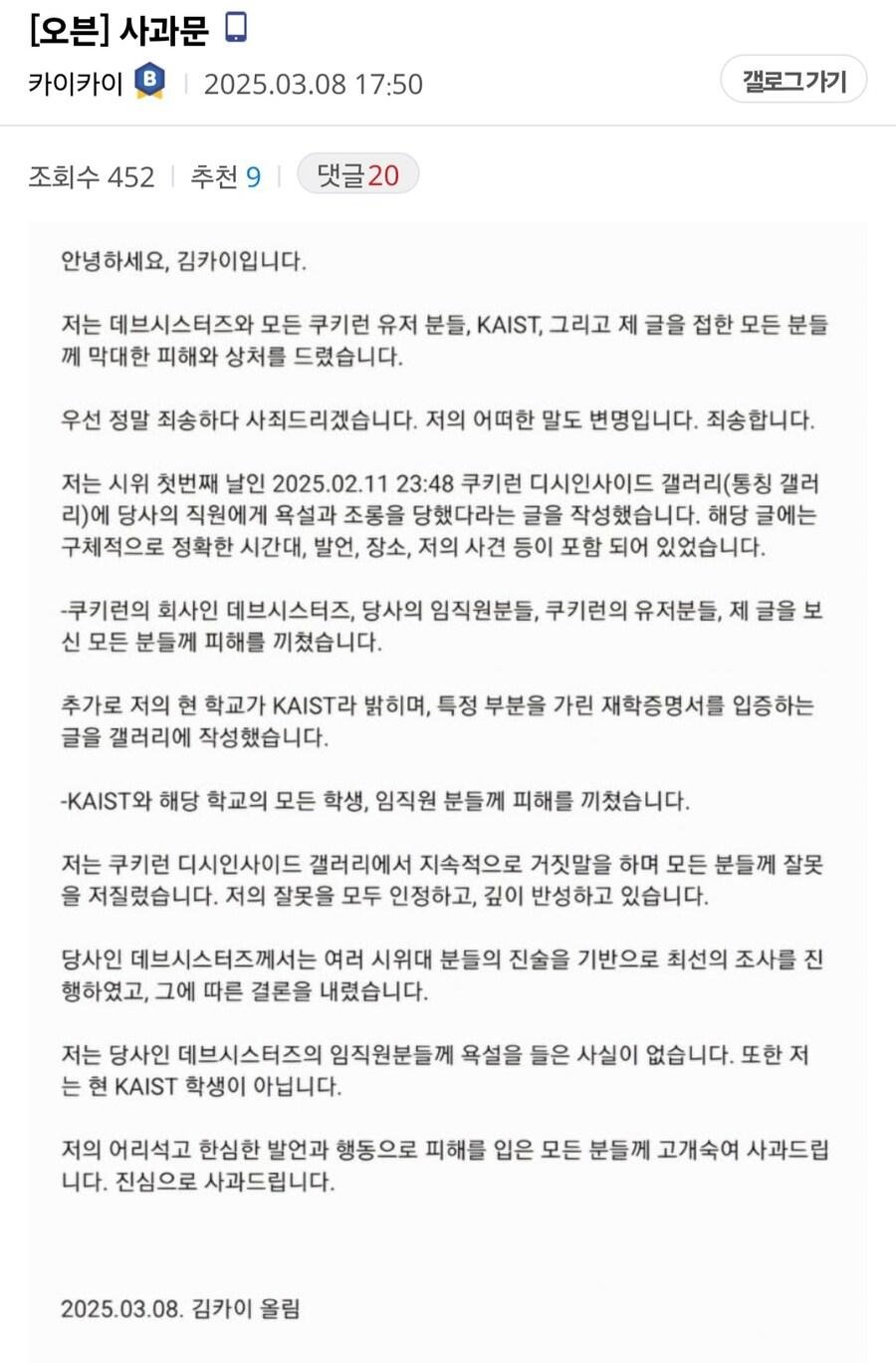 4. 자신이 카이스트라고 주장해온 쿠키런 총대 김카이는 사실 카이스트가 아니었고, 그간의 인증이 사문서위조로 이루어졌다는 사실이 검증됨. 총대는 카이스트 에타 계정을 구매해 인증에 이용해왔는데 본주가 해당 사실을 까발림.