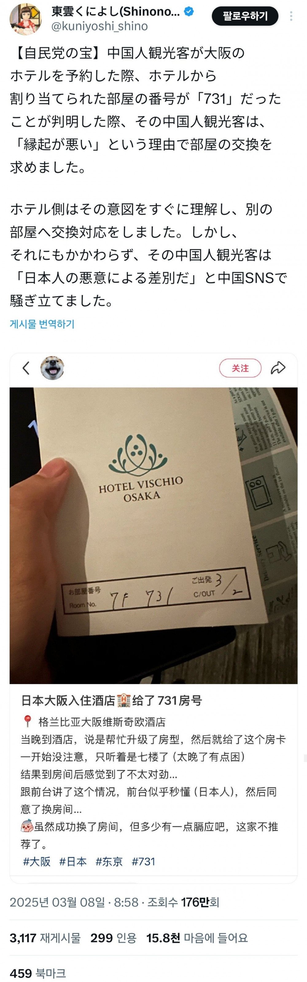 일본에서 중국인 관광객한테 호텔 방 번호 '731' 제공 논란 rh1 0 141 0 2025.03.09 14:15 중국인 관광객이 오사카 호텔에서 체크인중 방 번호가 731 것을 알아챔 중국인 관광객은 호텔측에 항의, 호텔측은 요구 수용 해당 중국인은 경험담을 중국 SNS에 올렸고 저 호텔 불매운동 하자고 거세게 항의중 731은 731부대를 뜻하는 것임 일본에서 중국인 관광객한테 호텔 방 번호 '731' 제공 논란 0