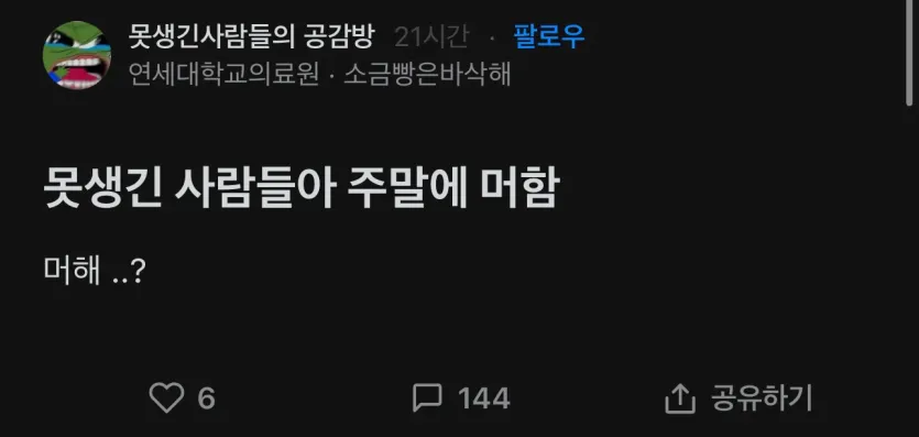 못생긴 사람들아 주말에 뭐해