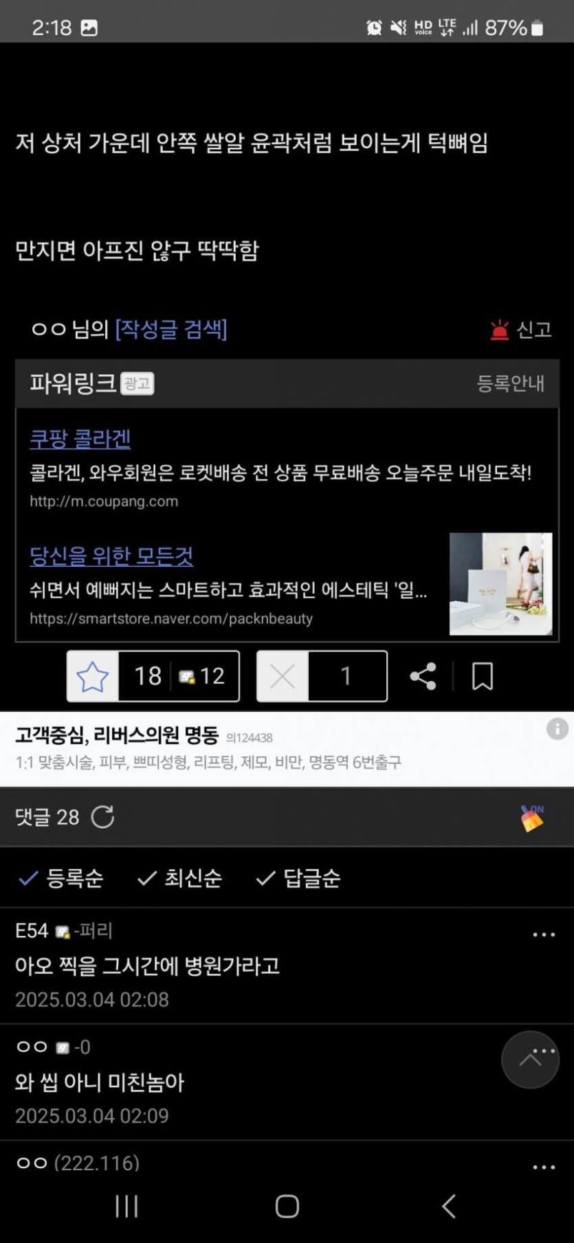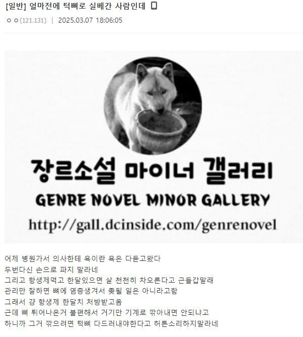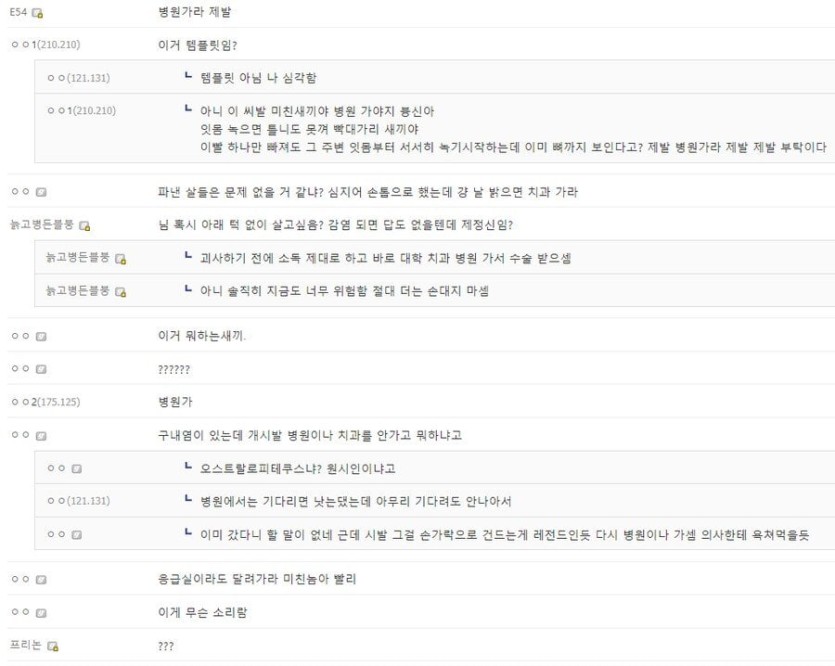 혐주의) 구내염 파낸다고 턱뼈 본 사람 근황 rh1 0 141 0 2025.03.08 16:15 날 밝으면 간다고해서 사람들 안심했었는데 안갈려고 함 ㅋㅋㅋㅋㅋㅋㅋ 결국 갔는데 ㄹㅇ 뼈 맞는거 같고 의사한테 욕먹었는데 슬쩍 그냥 깍아내면 안되냐고 물어보고 또 욕먹었다고 함 혐주의) 구내염 파낸다고 턱뼈 본 사람 근황 0