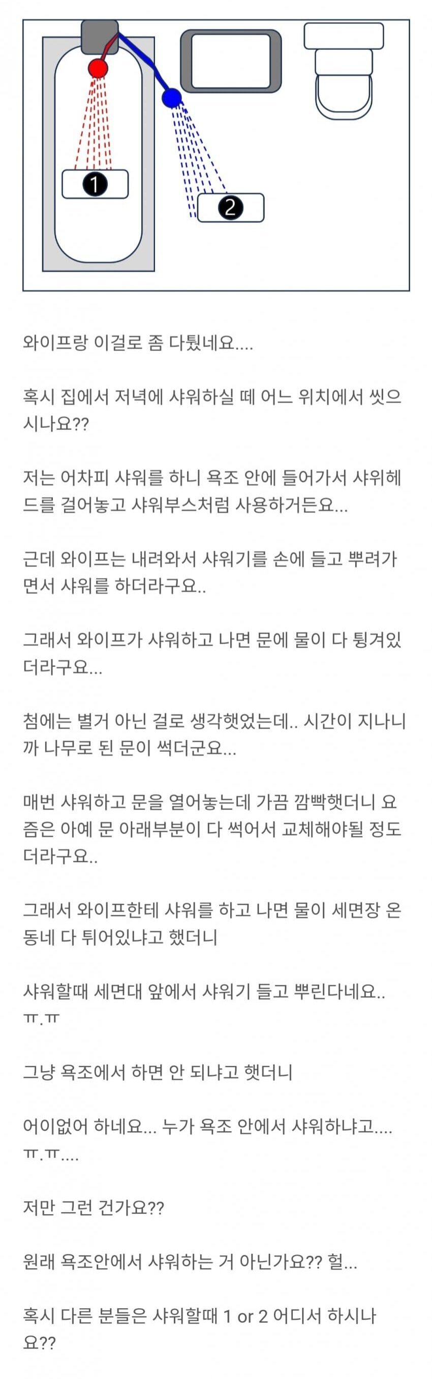 욕조 있는 집에서 샤워할 때 어느 위치에서 하시나요?