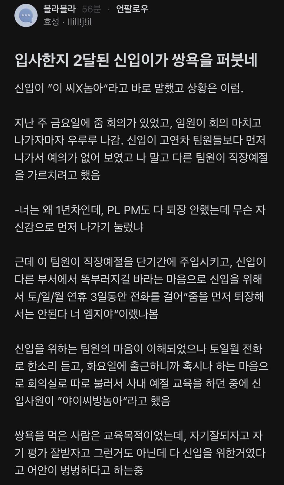 입사한지 2달된 신입한데 ㅅㅂ롬아 소리 들은 사람
