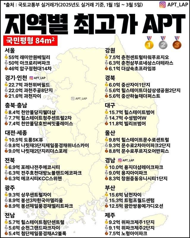 [기타] 올해 실거래가 기준 지역별 국민평형 최고가 아파트.jpg