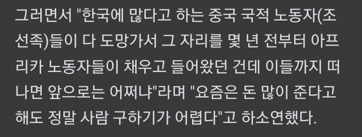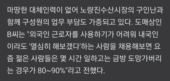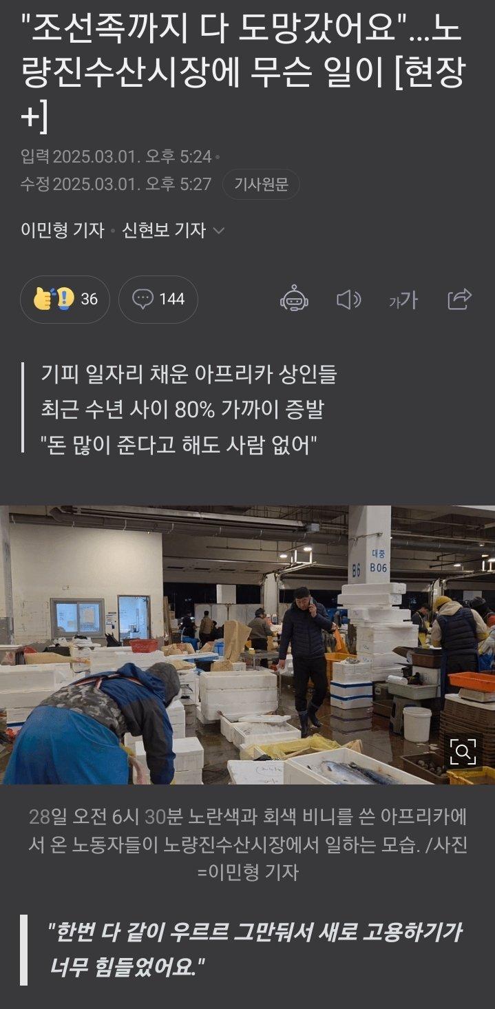 노량진 수산시장 최신 근황 ㄷㄷ.jpg rh1 0 65 0 2025.03.06 08:15 열악한 근무환경과 경악스러운 임금에 외국인들도 전부 도망가는 중이라 인력난이라고 함 한국인 직원을 구할 수 없어지자 조선족들을 썼고조선족들이 도망가자 아프리카인들을 썼고 이제는 아프리카인들 조차 도망가자 새로운 노예를 어디서 구해야 할 지 모르겠다며 앓는 소리하고 있음 가끔 뭣 모르는 젊은 애가 열심히 해보겠다해서 써보면 90%가 몇시간 뒤 추노 0