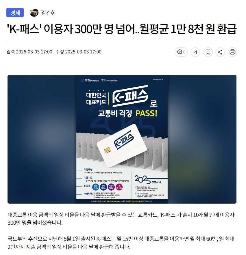 'K-패스의 대성공? 이용자 300만 명 넘어