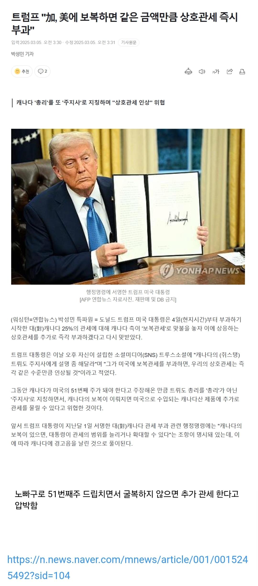트럼프 "캐나다 주지사가 보복 하면 그만큼 추가 관세 부과하겠다"