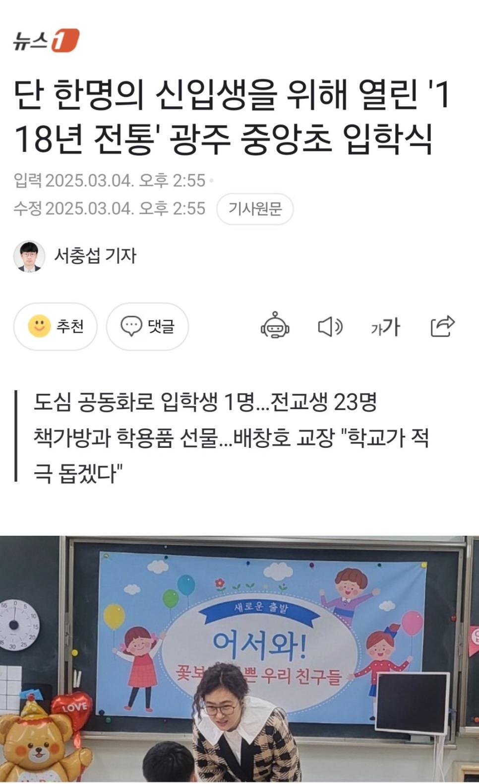 광주 중앙초등학교 입학생 1명