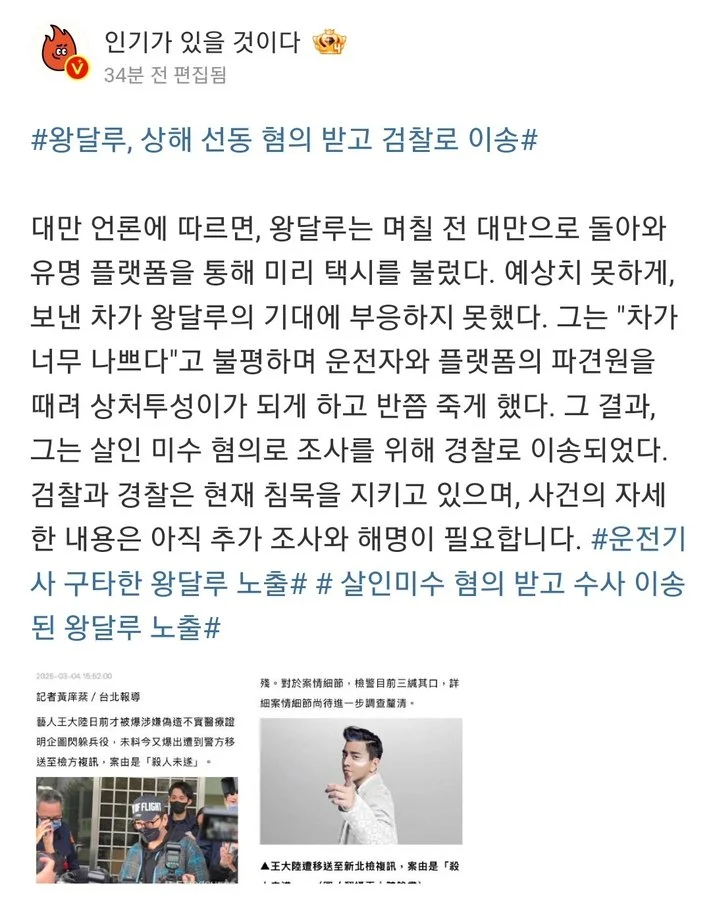 대만 유명배우 왕대륙, 살인 미수 혐의로 송치