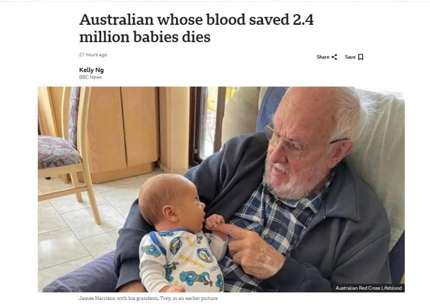 240만명의 신생아를 살린 할아버지 사망 rh1 0 403 0 2025.03.04 23:15 호주에 사시는 제임스 해리슨(88) 할아버지의 피는 희귀한 항체인 항-D가 포함되어 있었는데이는 엄마의 적혈구가 아기의 적혈구를 공격하는 HDFN를 치료하는데 사용되었다함 이를 알게된 할아버지는 18세부터 81세까지 평생을 아기들을 위해 혈장을 기증해 240만명의 아기들의 생명을 구했다고함 그리고 며칠전 요양원에서 잠을 주무시다가 편하게 사망함. 0