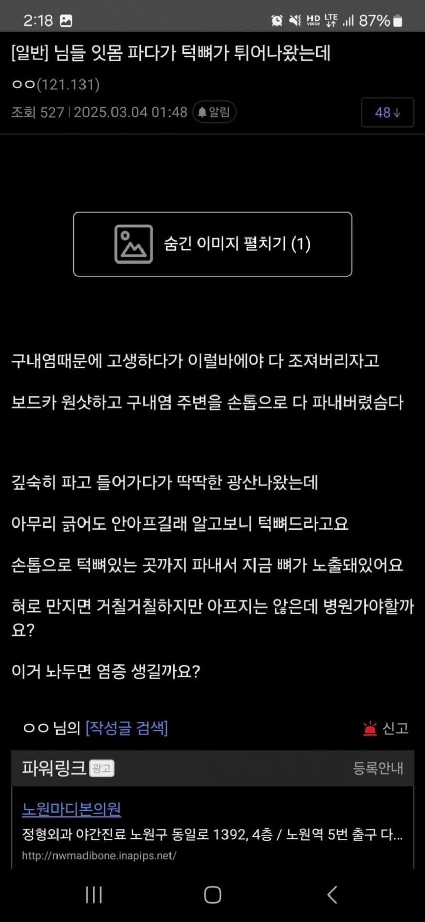 약혐)) 디시식 관우의 재림...잇몸파다 턱뼈나옴...jpg rh1 0 165 0 2025.03.04 13:45 오늘 새벽 장갤에 올라온글구내염 제거할려고보드카빨고 손톱으로 쑤시다 턱뼈 보였다함 ㄷㄷㄷ; 병원은 어떤곳일까... 0