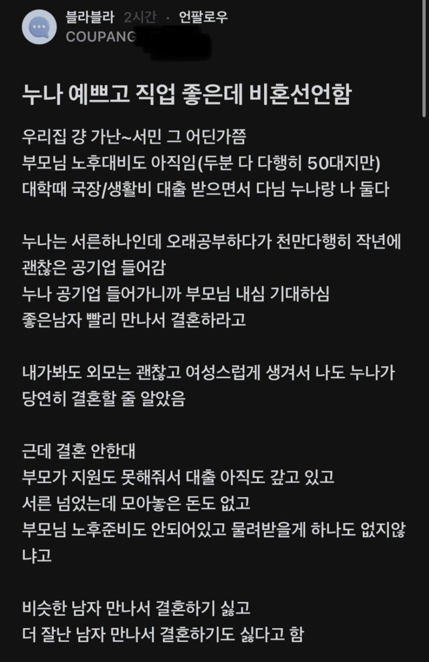 [유머] 블라) 누나 예쁘고 직업 좋은데 비혼선언함